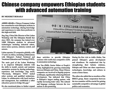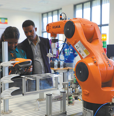 2021年揭牌运营以来,鲁班工坊培养了很多工业机器人、工业控制、传感器等方面的高技术人才。此前,埃塞俄比亚缺少相关领域的职业技术教育和培训,鲁班工坊与当地合作建立的机器人教育体系弥补了这一短板。 |
