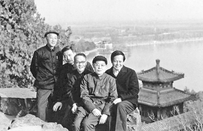 一九七四年,周光召同志(右二)同黄昆(左一)、邓稼先(左二)、黄宛(左三)、杨振宁(右一)游览北京颐和园时合影。 |