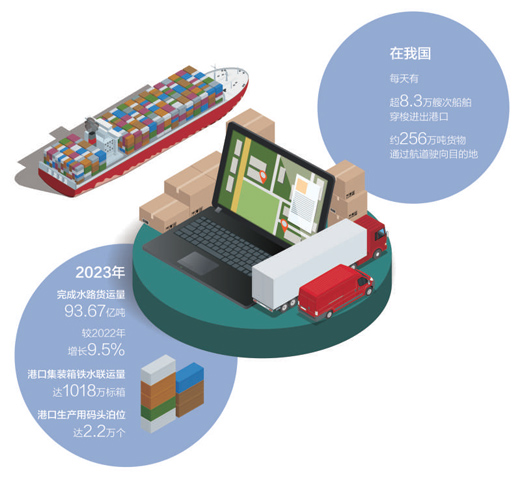 “近年来,通过大力推动‘公转铁’‘公转水’以及江海联运、水水中转,水路运输持续较快发展。”交通运输部水运局有关负责人说,以铁水联运为例,2023年,全国港口集装箱铁水联运量达1018万标箱,较2022年增长15.9%,助力水路运输在综合运输体系中的地位持续提升。2023年,水路货运量、水路货运周转量在综合运输体系中的占比分别提升0.2个百分点、0.3个百分点。