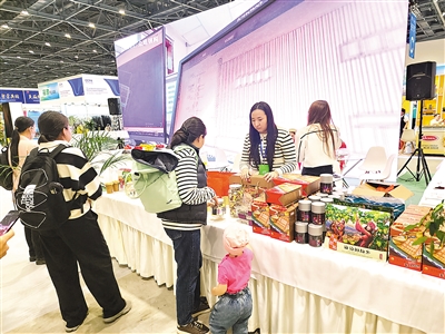 在一家中国食品企业展台前,参观者咨询了解中国特产。