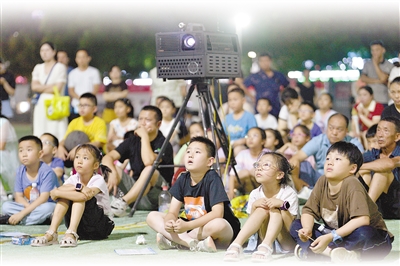 近日,在湖北省襄阳市保康县体育场,孩子们在观看电影。 |