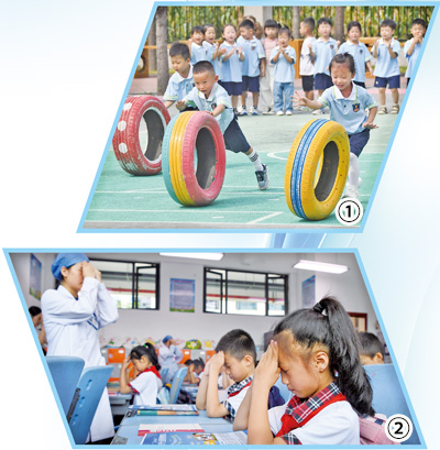 图①:河北省邯郸市永年区第二幼儿园,孩子们在参加“滚轮胎”游戏。 |
