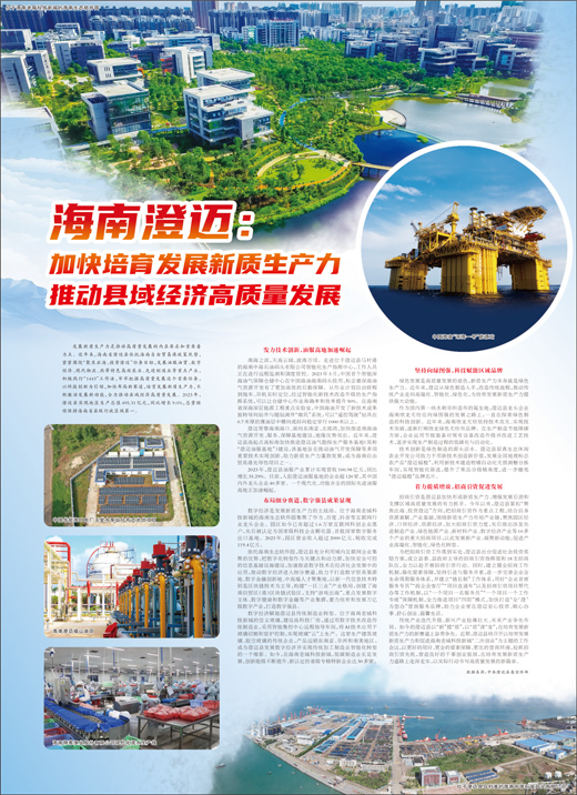发展新质生产力是推动高质量发展的内在要求和重要着力点。近年来,海南省澄迈县依托海南自由贸易港政策优势,紧紧围绕“聚焦出海、投资澄迈”任务目标,发展油服油贸、数字经济、现代物流、热带特色高效农业、先进制造业等重点产业,积极践行“1443”工作法,牢牢把握高质量发展这个首要任务,以科技创新为引领,加快布局新赛道,培育发展新质生产力,不断激活发展新动能,全力推动县域经济高质量发展。2023年,澄迈县实现地区生产总值495.31亿元,同比增长9.0%,总量继续保持海南省县级行政区域第一。