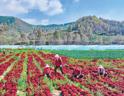 近年来,青海省海东市互助土族自治县依托当地的气候条件和生态优势,因地制宜发展高原冷凉蔬菜产业,助力乡村全面振兴。图为互助县台子乡长寿村村民正在采收红边生菜。