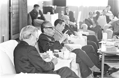 1991年4月6日,任建新同志(左二)参加七届全国人大四次会议山西省代表团小组会,听取代表们对最高人民法院工作报告的意见。 |