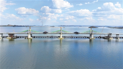 近日,由中国土木和中铁十五局联合承建的坦桑尼亚马古富力大桥主桥顺利合龙。马古富力大桥是坦桑尼亚重要的内陆国际通道,建成后将成为非洲最长矮塔斜拉桥,对提升坦桑尼亚国家形象、推动周边地区社会经济发展有着重要意义。图为马古富力大桥合龙现场。