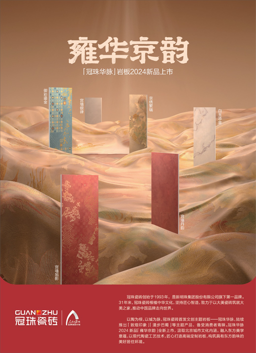 以陶为根,以城为脉,冠珠瓷砖首发文创主题岩板——冠珠华脉,陆续推出「敦煌印象」「漫步巴蜀」等主题产品,备受消费者青睐。冠珠华脉2024新品「雍华京韵」全新上市,汲取北京城市文化内涵,融入东方美学意蕴,以现代陶瓷工艺技术,匠心打造高端定制岩板,构筑具有东方韵味的美好居住环境。