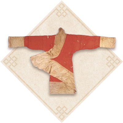 湖南长沙马王堆一号墓出土朱红菱纹罗丝绵袍,中原曲裾样式代表。 |