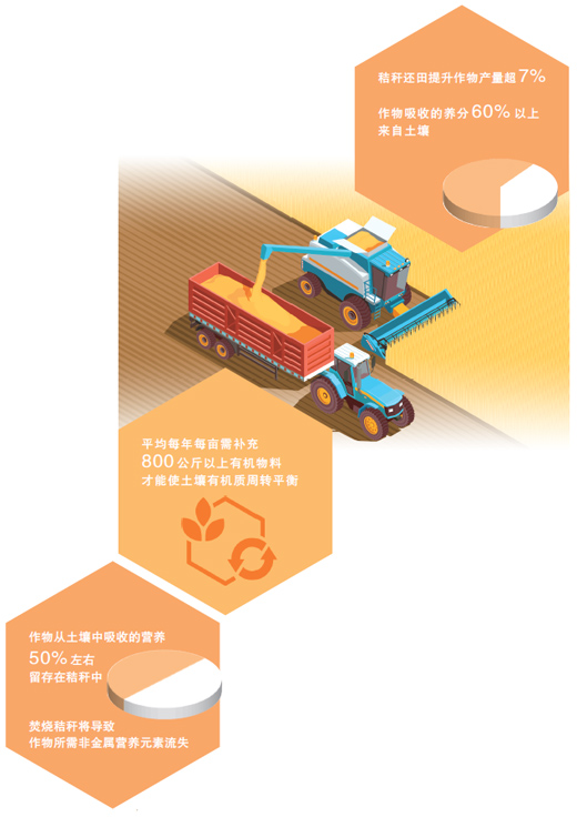 研究显示,秸秆还田技术能提升作物产量超7%。据业内专家分析,作物吸收的养分60%以上来自土壤,平均每年每亩需要补充800公斤以上的有机物料,才能使土壤有机质周转平衡。因此,“秸秆还田对补充耕地有机质来说是有必要的,尤其是在有机肥源少、大田施用困难的情况下。”农业农村部农村经济研究中心绿色发展团队首席专家金书秦表示。