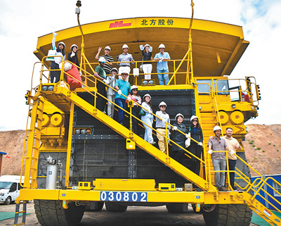 国际青年代表在国能准能集团绿色矿山登上无人驾驶卡车合影留念。 |