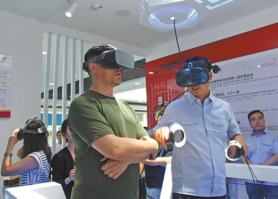 国际青年代表在玉门风电场VR电力安全生产实训室体验。 |