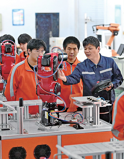 江西省抚州市东乡区高级技工学校工业机器人技能实训基地,学生在练习智能机械臂编程和操作技术。 朱海鹏摄(影像中国)
