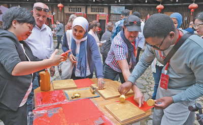 图为与会代表在福建省漳州市南靖县体验拓印技艺。