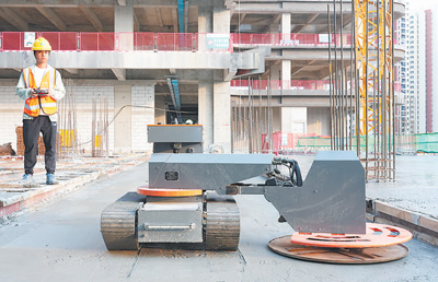 工地上,各式各样的机器人正成为工人的“左膀右臂”,在混凝土浇筑、地砖铺设等劳动强度较大的工序中大显身手。