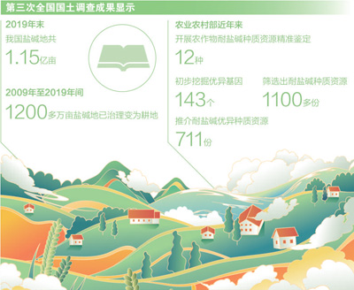 农业农村部联合各地各部门和研究机构,积极推动小麦、水稻、大豆等作物耐盐碱品种的研发、试验和推广,深入推进耐盐碱作物育种攻关和品种审定,持续强化品种示范推广,结合高标准农田建设促进盐碱地治理,让白花花的盐碱地产出金灿灿的收益,为挖掘盐碱地粮食产能提供了强有力支撑。