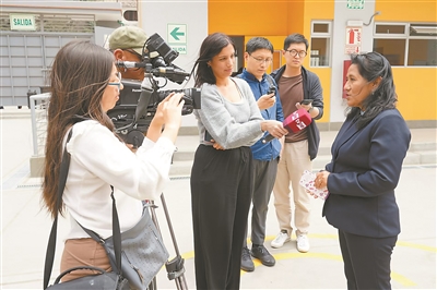 在秘鲁拉利伯塔德大区的哥伦比亚共和国学校,中秘两国媒体对校方工作人员进行联合采访。 |