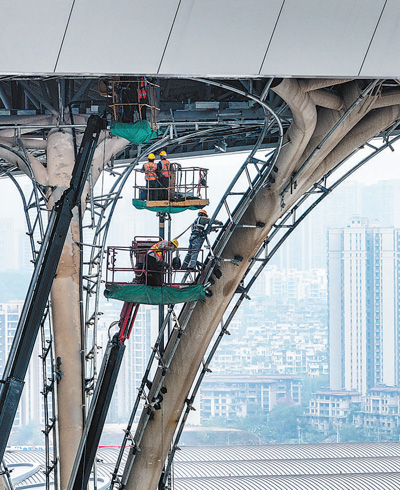 11月5日,我国西部地区最大高铁枢纽重庆东站站房工程全面进入室内装饰装修阶段。目前,重庆东站高架候车层外立面幕墙、金属屋面、天窗已基本完工,室内吊顶、地面石材铺贴等施工正在同步推进,有望今年年底基本完成室内外装饰装修和机电安装施工。图为工人在重庆东站站房工程建设现场施工。