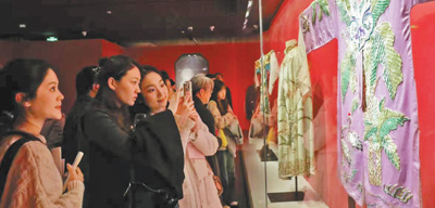 观众在参观“梅韵霓裳——北京京剧院藏梅兰芳、梅葆玖戏曲服饰展”。 |