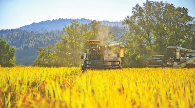 收割机正在收割黎米。 |