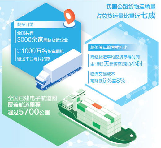 我国公路货物运输量占总货运量比重近七成,网络货运新模式的出现,在降低全社会物流成本的同时,改变了长期以来公路运输市场“小、散、乱”的特点。相关调查显示,与传统运输方式相比,网络货运平均配货等待时间由1到3天缩短至6到8小时,物流交易成本可降低6%至8%。