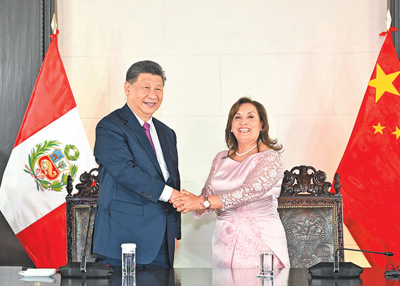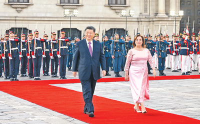 习近平指出,这是我第三次访问秘鲁,也是一年时间里第三次同总统女士会晤。许多秘鲁民众自发聚集道路两旁,挥手致意表示欢迎,让我深切感受到秘鲁人民对中国人民的友好情谊。中秘同为文明古国。古老文明的深厚积淀,赋予中秘两国智慧和胸怀,让我们能够看清历史前进方向,顺应时代发展潮流,始终坚持平等相待、互尊互信、互学互鉴,成为不同体量、不同制度、不同文化国家团结合作的典范。建交53年来,特别是我2016年对秘鲁进行首次国事访问以来,在双方共同努力下,中秘贸易投资合作快速增长,为两国人民带来实实在在的利益。双方要总结经验,推动两国务实合作提质升级,使中秘全面战略伙伴关系不断迈上新台阶,更好造福两国人民。