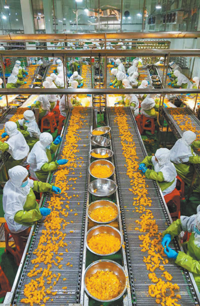 11月14日,湖南省永州市冷水滩区一家食品公司内,工人在柑橘加工车间生产线上制作柑橘罐头。近年来,当地大力发展柑橘加工产业,帮助农民多渠道增收。