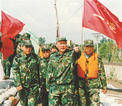 一九九八年八月,梁光烈同志在哈尔滨地区指挥部队抗洪抢险。 |