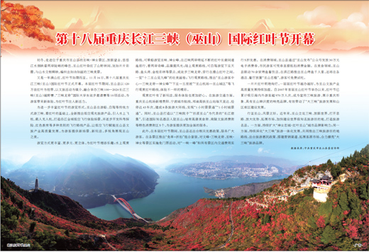 又是一年满山红,红叶节如期而至。11月16日,第十八届重庆长江三峡(巫山)国际红叶节正式开幕。本届红叶节期间,巫山县以120万亩红叶为纽带,以文旅活动为媒介,融合举办三峡100—2024长江三峡(巫山)越野赛、“三峡龙脊”国际大学生徒步邀请赛等10项活动,为游客带来新体验,为红叶节注入新活力。
