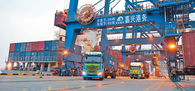 氢能重卡往返于港口与周边城市,氢能物流车穿梭于城市之中,氢能集装箱船舶即将下水航行……近年来,浙江嘉兴港区持续拓展氢能示范“应用链”。图为11月22日,氢能重卡正在集装箱码头进行运输作业。