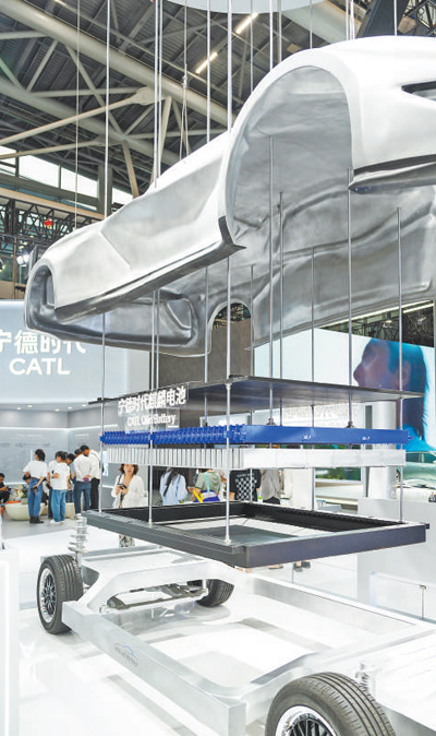 宁德时代展台上展出的锂电池模型。 |