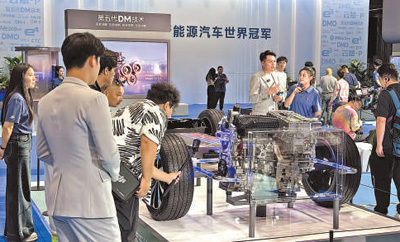 观众在车展上观看比亚迪插电混动技术展示。 |