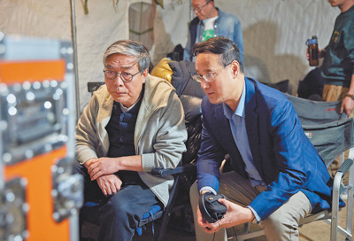 图为《西北岁月》总导演董亚春(左)和总制片人王勇在工作中。 |