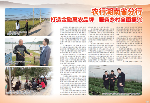 中国农业银行湖南省分行(简称“农行湖南省分行”)认真贯彻落实党中央关于推进乡村全面振兴的决策部署,围绕“建设服务乡村振兴的领军银行”定位,依托惠农品牌建设提升农村金融服务水平,创新推出“湘村振兴通”品牌,持续打造“惠农大讲堂”品牌。着力解决县域金融服务网络不广、服务能力不强、宣教培训渠道不畅、产品创新速度不快等问题,有力有效服务乡村全面振兴。
