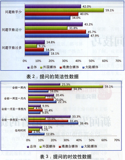 从提问的及时性来看,超过50%的媒体提出的问题是最近一个季度内发生的事件,时效性较强,其中,境外媒体提问的时效性要明显好于大陆媒体,59.1%的外国媒体的提问是一周内的新闻事件,而大陆媒体经常会提问一些老生常谈的“必选项目”,10.8%是年年都有的例行问题,并没有新意(见表3)。