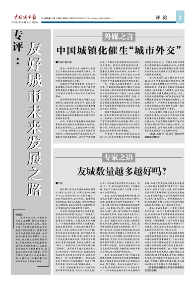 发展更多友城固然是推进城市国际化进程的重要组成部分,但是纯粹数量的增加而没有质量的提升,只会让我们的对外交往之路越走越窄,同时还会因为精力分散而影响到已有的友城关系,造成事倍功半的结果。把工作重心转向固有友城关系的发展上,通过对接上层战略机遇、培育和发展各自特色、做到以民为本,我们的城市才能真正走出一条高效、可持续的国际化发展之路,进而推动我国从外交大国向外交强国转变。