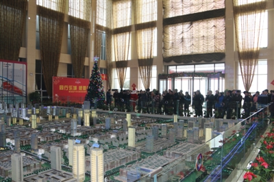 在展示大厅内,人头攒动,热闹非凡。讲解员正在为从北京赶来的商户门介绍着商贸城的情况,硕大的沙盘尤为醒目。