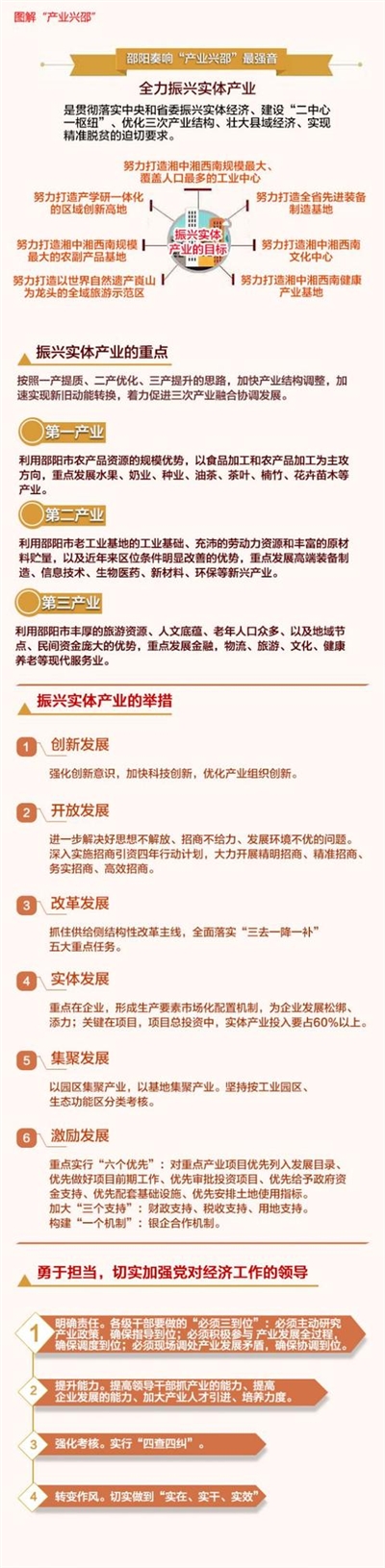 这些重点发展的产业涵盖一二三产业,将按照一产提质、二产优化、三产提升的思路,加快产业结构调整,加速实现新旧动能转换,着力促进三次产业融合协调发展。第一产业利用邵阳市农产品资源的规模优势,以食品加工和农产品加工为主攻方向,重点发展水果、奶业、种业、油茶、茶叶、楠竹、花卉苗木等产业。第二产业利用邵阳市老工业基地的工业基础、充沛的劳动力资源和丰富的原材料贮量,以及近年来区位条件明显改善的优势,重点发展高端装备制造、信息技术、生物医药、新材料、环保等新兴产业。第三产业利用邵阳市丰厚的旅游资源、人文底蕴、老年人口众多、以及地域节点、民间资金庞大的优势,重点发展金融,物流、旅游、文化、健康养老等现代服务业。