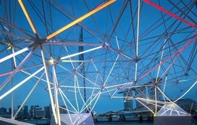 Light Network灯光艺术装置,是由新加坡科技设计大学的两位教授费利克斯·拉斯波尔(Felix Raspall)和卡洛斯·班农(Carlos Banon)设计制作。整个灯的造型跨度达10米,与其他装置结构构造不同,该发光装置是一个四面体网格形态,利用3D打印将装置的功能性与审美性完美结合。