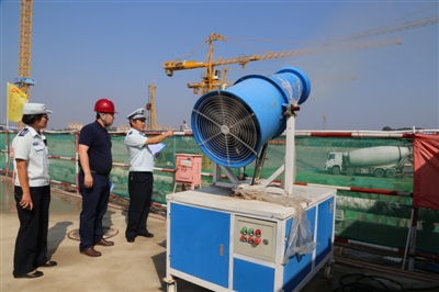 日前,北京平谷城管执法局在全区范围内集中开展施工工地防尘控污秋季攻势专项执法行动,严控大气污染源。平谷城管队员对某工地进行检查。检查发现该工地的施工作业面和土方等易产生扬尘的地方基本覆盖,洒水降尘等防尘措施开展的比较到位。图为工地工作人员向城管队员介绍雾炮和自制喷淋洒水设置。 通讯员 崔平/图文