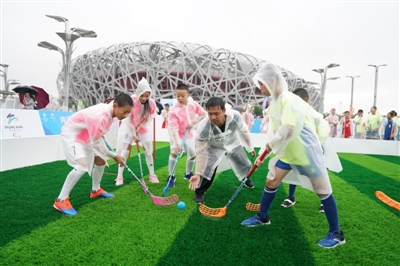 8月8日,北京夏季奥运会成功举办10周年纪念日,也是第10个全国“全民健身日”。当天,2018年全国“全民健身日”主会场活动·北京2022年冬奥会和冬残奥会吉祥物全球征集启动暨北京奥运城市体育文化节开幕式在北京奥林匹克公园庆典广场举行。图为开幕式上,小朋友们表演旱地冰球。