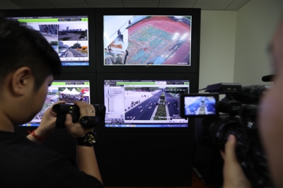 时值暑期,北京奥林匹克公园正处于旅游旺季,日均流量达20万。巨大的客流也吸引不少“黑导游”“黑照相”。近日,奥园城管大队展开了对无证导游的专项检查整治行动。据了解,经过最近几年的持续打击,奥林匹克公园内的“黑导游”“黑照相”已经比较少见,但还有少数“黑导游”谎称“免费讲解员”,实则进行“黑导游”活动。图中监控系统是执法人员锁定疑似“黑导游”的利器。