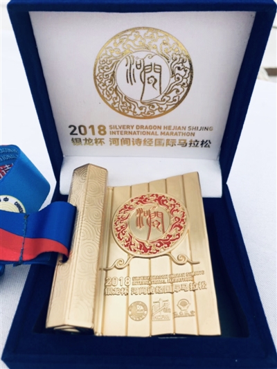 终点处,奖牌已恭候我多时。它是一部翻开的竹简,正面是赛事名称配上红色祥云纹包裹的河间篆体Logo,反面是《诗经·关雎》的刻文。