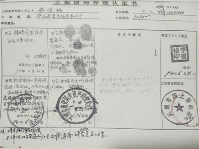 记者查阅了李俊福提供的于2009年7月19日从兴城国土局复印的档案,其中《土地使用界线认定书》第13页最底部显示:“注:停车场南北长度以评估时确定的70米为准,其南之界对应公道为1.6米。”上面并无加注日期及签名。