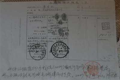 在国土局档案中土地登记卡续表第二段记者看到:“2009年5月6日,依据宗地四至认定的文字叙述及现场勘测定界图进行更正登记,登记面积为5341.7平方米。经办人:谭德海 侯慧明。”