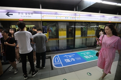 6月17日,北京地铁6号线金台路站站台地面张贴了“同车不同温”的指示标。为了满足不同乘客的不同需求,近日,北京地铁6号线开始尝试分设“强冷车厢”和“弱冷车厢”。“强冷车厢”内的平均温度约为24℃、“弱冷车厢”约为26℃。乘客可根据指示标按需乘车。