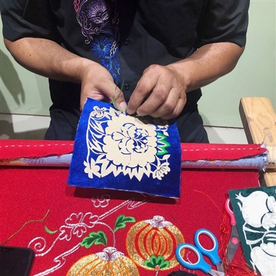今年46岁的卡德尔·热合曼是目前维吾尔族刺绣非遗传承人中唯一一位“绣郎”。与另外一位女性刺绣传承人热娜古丽·素批不同的是,卡德尔·热合曼的绣法保留了传统的刺绣技艺和手工方式:以剪纸绘图,再将之叠放于织布上加以刺绣。