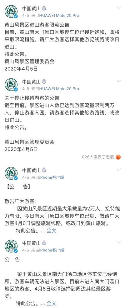 随后,黄山景区5小时内连发4则公告:黄山南大门汤口区域停车位已接近饱和,即将限流;景区进山人数已达游客流量限制两万人,停止入园;景区近期最大承载量为2万人,接待能力有限,敬请广大游客4月6日调整旅游线路;鉴于黄山景区南大门汤口地区停车位已饱和,游客车辆无法进入景区,目前未进入南大门汤口地区的游客,4月6日敬请选择到周边其他景区游览……
