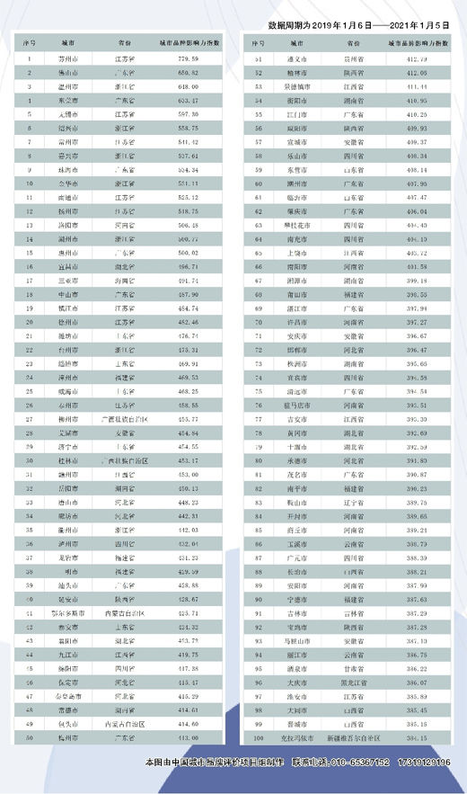 为落实习近平总书记关于“城市建设必须把让人民宜居安居放在首位,把最好的资源留给人民”重要指示,推动城市高质量发展,中国城市品牌评价项目组、人民日报社属中国城市报依据国际标准《品牌评价基础和原则》(ISO 20671:2019)和国家标准《品牌评价 城市》(GB/T 35779-2017),运用国家部委近两年的相关数据,对全国293个地级市进行标准化分析,最终计算出各城市品牌综合影响力指数(不含省会以上城市),并于近日在上海举行的2021中国品牌日系列活动上发布前100名城市名单。