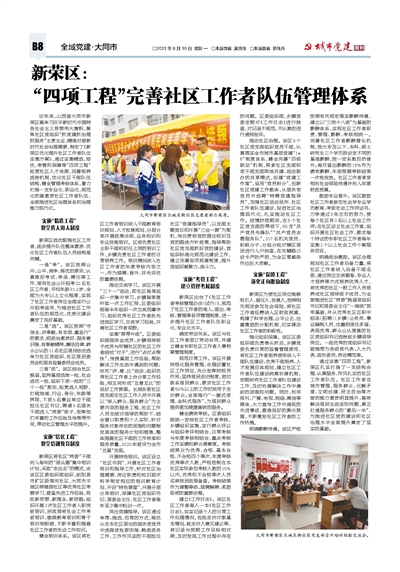 近年来,山西省大同市新荣区高举习近平新时代中国特色社会主义思想伟大旗帜,聚焦社区党组织“抓党建抓治理抓服务”主责主业,精准对接新时代社会治理需要,制定了《新荣区优化提升社区工作者队伍实施方案》,通过实施精选、培优、考管和保障等“四项工程”拓宽社区人才来源,完善培养选拔机制,优化社区干部队伍结构,健全管理考核体系,着力打造一支专业化、职业化、规范化的高素质社区工作者队伍,全面推进社区治理体系和治理能力现代化。