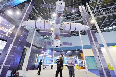 图为10月20日,观众北京会场主题展上参观中国空间站天和核心舱模型。